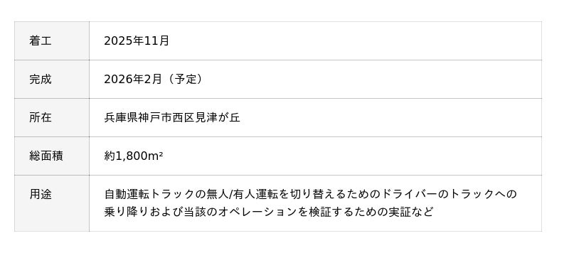 T2は、上記の「レベル4」自動運転トラックによる幹線輸送サービスの開始に向けて、兵庫県神戸市の山陽自動車道・神戸西ICに近接する土地に、国内の物流事業者としては関西で初めて、高速道路における無人運転と、ICと顧客の物流拠点を結ぶ一般道での有人運転を切り替えるためにドライバーがトラックに乗り降りする拠点(以下「切替拠点」)を設置します。すでに着工済みの神奈川県綾瀬市の切替拠点とあわせて、ネスレ日本を含めた関西に地盤を置く企業の自動運転トラックの利用を想定した関東ー関西の幹線輸送体制の確立を図ります。