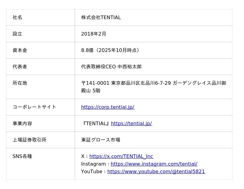 コンディショニングブランド『TENTIAL』は、アスリートの知見と最新技術・研究に基づき、機能性を追求した製品・サービスを提供。24時間365日、日常生活のあらゆるシーンで心身を整え、疲労回復やパフォーマンス向上をサポートするコンディショニング活動を推進しています 。すべては個人のコンディションとポテンシャルを引き出すという信念のもと、株式会社TENTIALは、健康に前向きな社会の実現のため、コンディショニングの社会実装に取り組んでまいります。