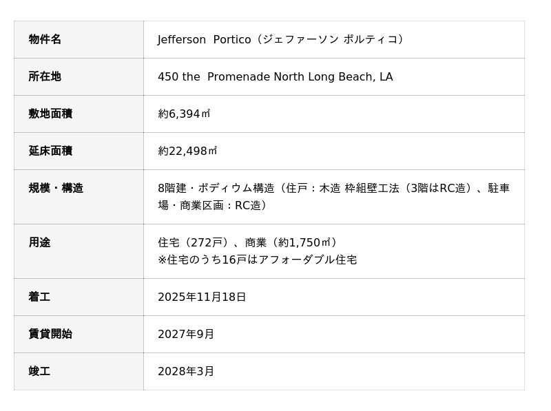東京建物株式会社と住友林業株式会社は、東京建物の米国現地法人Tokyo Tatemono US Ltd.(以下「東京建物US」)と住友林業の連結子会社JPIグループ(以下「JPI」)を通じて、カリフォルニア州ロングビーチ市における賃貸住宅開発事業である「Jefferson Porticoプロジェクト」(以下「本事業」)に参画し、2025年11月18日に新築着工したことをお知らせします。