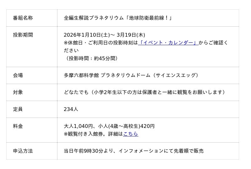 多摩六都科学館(東京都西東京市、館長:高柳雄一。以下、当館)では、2026年1月10日(土)より地球防衛の最前線を科学的視点で深く掘り下げる全編生解説プラネタリウム新番組「地球防衛最前線!」を投影します。