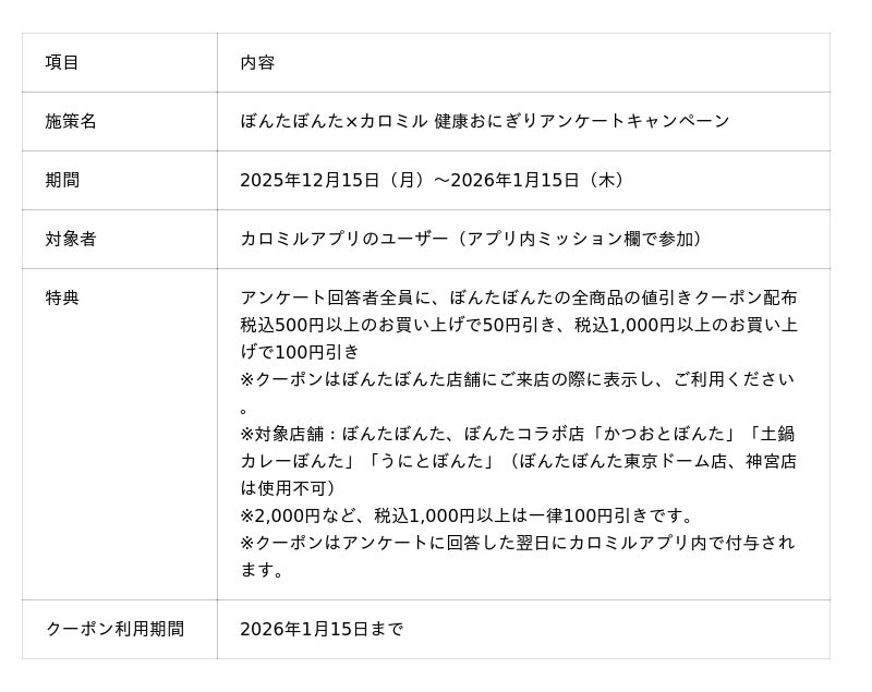 本キャンペーンでは、アンケートに回答いただいた方全員に、ぼんたぼんた店舗で使える「割引クーポン」をプレゼント。価格が高騰するお米を、ぼんたぼんたのおにぎりで手軽に、お得に楽しんでいただく機会を提供します。さらに、キャンペーンに先立ち、カロミルが保有する食事データから見えた「カロミルユーザーのおにぎり事情」に関するデータも合わせて公開します。