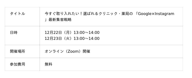 12月22日(月)・12月23日(火)13:00より、今すぐ取り入れたい!選ばれるクリニック・薬局の 「Google×Instagram」最新集客戦略(無料セミナー)を開催いたします。