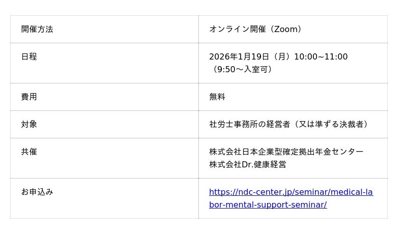 株式会社日本企業型確定拠出年金センター(愛知県名古屋市、代表取締役:久野勝也)と株式会社Dr.健康経営(東京都港区、代表取締役社長:田中 茂揮)は、社労士事務所の経営者および決裁者を対象に、企業のメンタルヘルス対応に特化した無料オンラインセミナーを共催いたします。