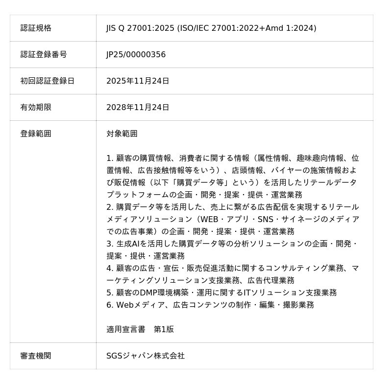 リテールメディア事業等を展開する株式会社フェズ(本社:東京都千代田区、 代表者:代表取締役 赤尾 雄司、以下「フェズ」)は、情報セキュリティマネジメントシステム(ISMS)の国際規格「ISO/IEC 27001:2022+Amd 1:2024(JIS Q 27001:2025)」の認証を取得しましたので、お知らせします。