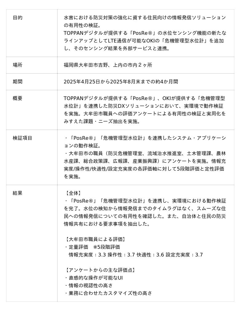福岡県大牟田市(市長:関 好孝、以下 大牟田市)では、デジタル化が急速に進展していく中、持続的な地域経済の発展や地域企業の成長に向け、大牟田市イノベーション創出拠点「aurea」を中心に、IT関連企業等の誘致をはじめ、デジタル人材の育成、地域企業のデジタル化促進などのイノベーション創出促進事業に取り組んでいます。こうした中、「aurea」の入居企業であるTOPPANデジタル株式会社(本社:東京都文京区、代表取締役社長:坂井 和則、以下 TOPPANデジタル)と沖電気工業株式会社(本社:東京都港区、代表取締役社長:森 孝廣、以下OKI)は、豪雨による水害時の迅速な情報発信を目的に、河川水位の自動検知と住民向けの情報発信を連携した防災DXソリューション(以下、本ソリューション)の実証実験を、2025年4月25日から8月末までの約4カ月間、大牟田市吉野、上内の市内2ヶ所で実施しました。本実証後、大牟田市職員への評価アンケートなどを実施し、本ソリューションの有用性を確認しました。