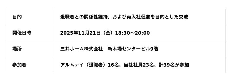 三井ホーム株式会社(本社:東京都江東区、代表取締役社長:野島秀敏、以下「当社」)は、2025年11月21日(金)に、当社社員とアルムナイ(退職者)との交流イベント「アルムナイイベント」を開催しました。本イベントは、退職者に現在の当社について理解を深めていただき関係性を維持すること、および再入社促進を目的とした交流イベントとして実施しました。