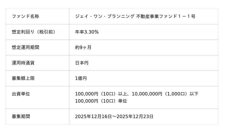 貸付型クラウドファンディング「Funvest」12/16より新ファンド「ジェイ・ワン・プランニング 不動産事業ファンド1-1号」の募集開始