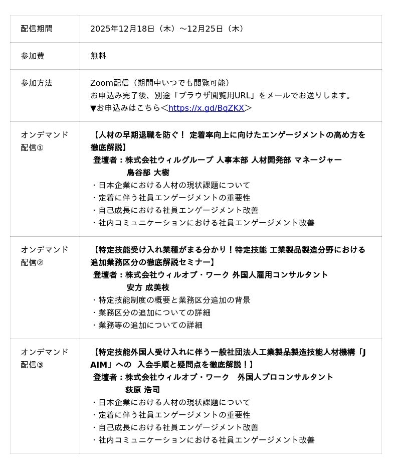 ウィルグループの総合人材サービスを手掛ける株式会社ウィルオブ・ワーク(本社:東京都新宿区、代表取締役社長:村上 秀夫)は、製造業の人事・採用担当者様から特に人気の高かったオンラインセミナー3種を一挙公開するオンデマンド配信を、2025年12月18日(木)~12月25日(木)の期間で実施いたします。