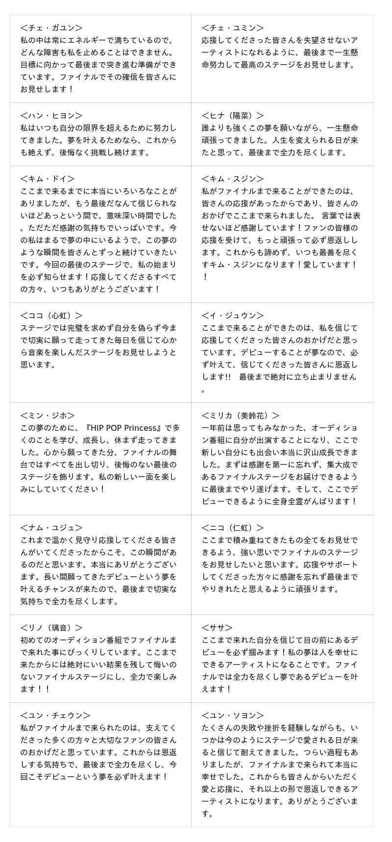 『HIP POP Princess』は、i-dleのソヨン、Gaeko、RIEHATA、岩田剛典らメインプロデューサー4人のもと、日韓の参加者40人がグローバルに活躍するヒップホップグループの誕生を目指すサバイバルオーディション。プロデューサー新曲ミッション、ディスバトルなど数々の熾烈な争いを勝ち抜き、以下の16名がファイナリストとして選ばれました。
