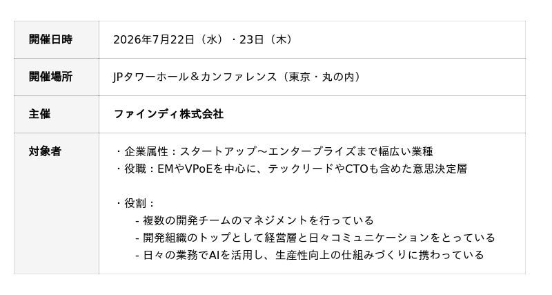 本カンファレンスは、スタートアップからエンタープライズまで幅広い業種のエンジニア、EM、VPoE、CTOなど意思決定層が集い、開発生産性に関する最新の知見が集まる場として、2026年7月22日(水)・23日(木)の2日間、オンライン・オフラインのハイブリッドにて開催します。昨年は4,500名のお申し込みをいただき、大きな反響を呼びました。今年も、開発生産性の向上に取り組むベストプラクティスや事例を2日間にわたり共有することを目的としたカンファレンスを目指します。