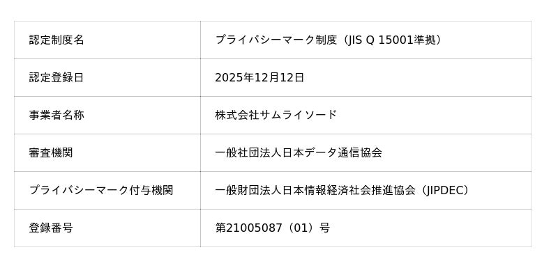 株式会社サムライソード(本社:東京都豊島区、代表取締役:比企 良公)は、一般財団法人日本情報経済社会推進協会(JIPDEC)よりプライバシーマーク(Pマーク)の認定を取得いたしましたのでお知らせいたします。