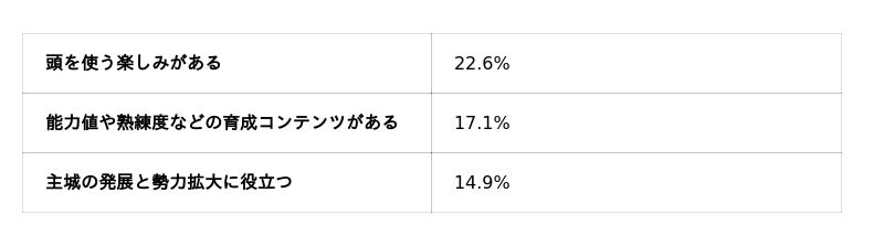 「高く評価している理由」として最も多く選ばれたのは、「戦国武将を用いた部隊編制システムが面白いから」でした。