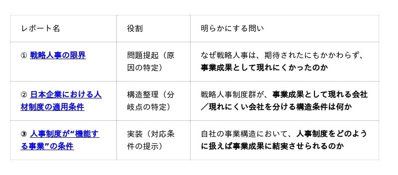 OrgLogLab(R)(組織論理学(R))研究センター・人的資本開発プランニング(R)センターを運営するリクエスト株式会社(本社:東京都新宿区、代表取締役:甲畑智康)は、33.8万人・980社の行動・制度・事業構造データの分析をもとに、戦略人事・CHRO・ジョブ型・人的資本経営が、なぜ事業成果として現れにくい状況が生じるのかを明らかにすると同時に、どのような条件を満たせば事業成果として結実させられるのかまでを整理した、3本のレポートシリーズを体系的に公開しました。
