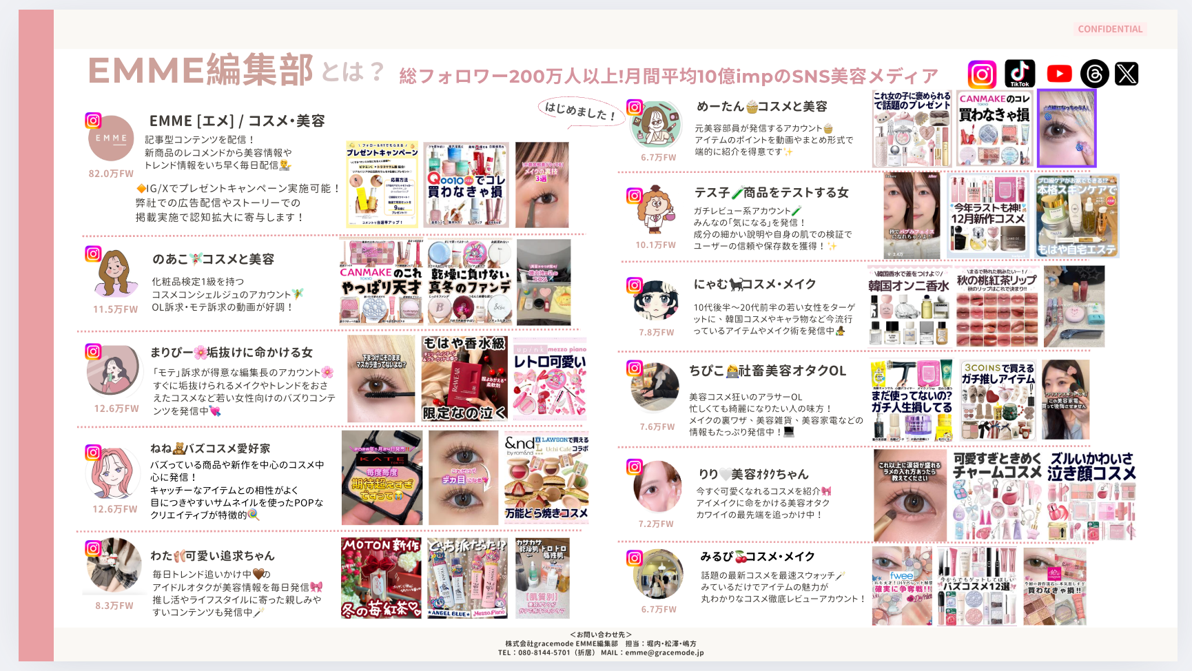 簡単&すぐに実践できる美容情報やトレンド情報を毎日発信している国内最大級(*2)のSNS美容メディア。EMME+EMME編集部アカウント合わせて、総フォロワー200万人以上、月間10億impを誇るSNS美容メディアです。
