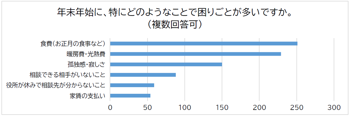 年末年始に特に困ることとして、「食費」(56%)「暖房費・光熱費」(51%)が最も多く、経済的な負担が際立ちました。加えて「孤独感・寂しさ」(34%)、「相談できる相手がいない」(20%)など、心理的・社会的孤立も顕著です。「役所が休みで相談先が分からない」も一定数おり、年末年始に複合的な不安が高まる状況が示されました。