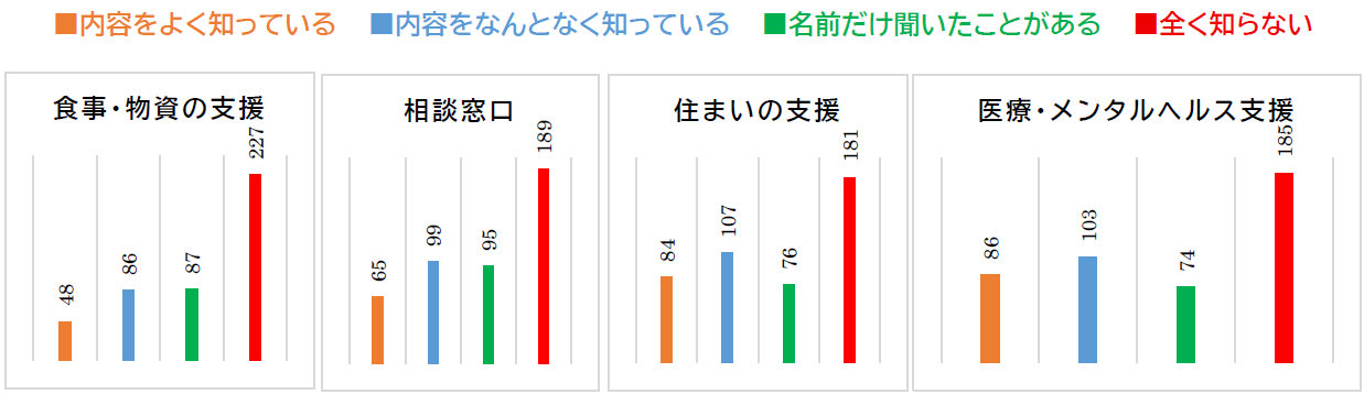 ・相談窓口・住まい支援・医療支援でも4割前後が「全く知らない」