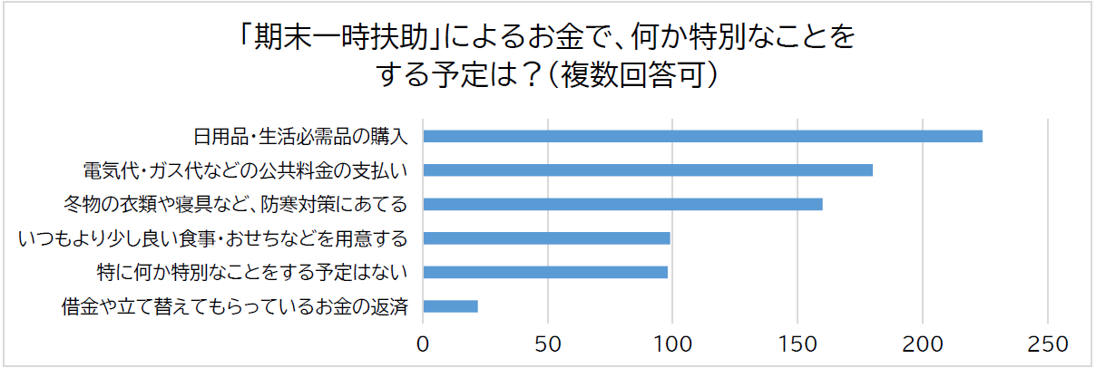 年末に支給される期末一時扶助については、「日用品・生活必需品」(44%)、「公共料金の支払い」(40%)、「防寒対策」(36%)が上位となり、生活維持に直結する用途が中心でした。「物価高で足りない」「特別なことには使えない」といった声も多く、年末の特別な出費より、日常生活を繋ぐために使われている実態が明確でした。