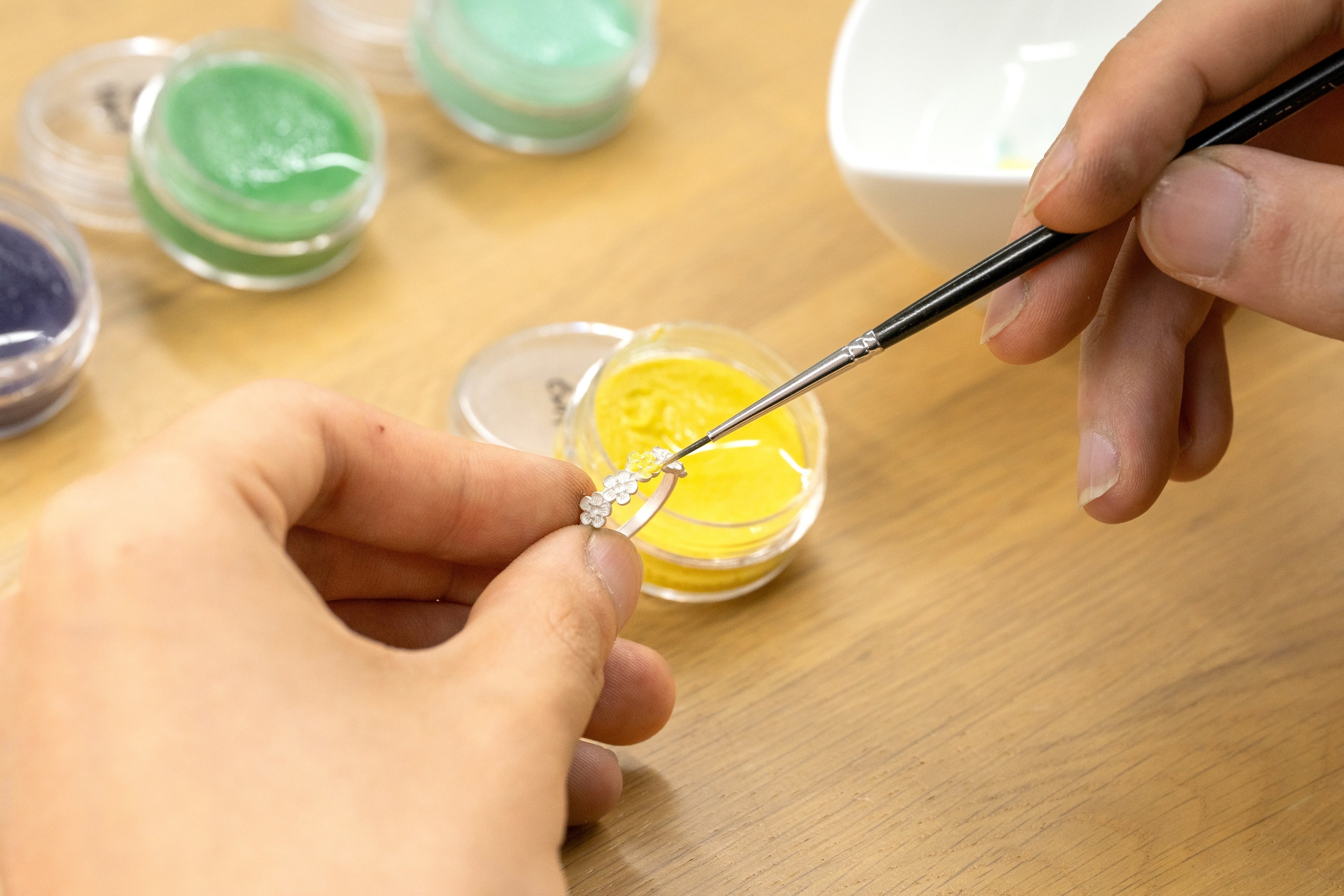 また、エマーユで選べる釉薬(ゆうやく)のカラーも新たに5色が追加され、全13色の色彩豊かなカラーリングで、更に自由で美しく、自分らしいジュエリーをお作りいただけるようになりました。
