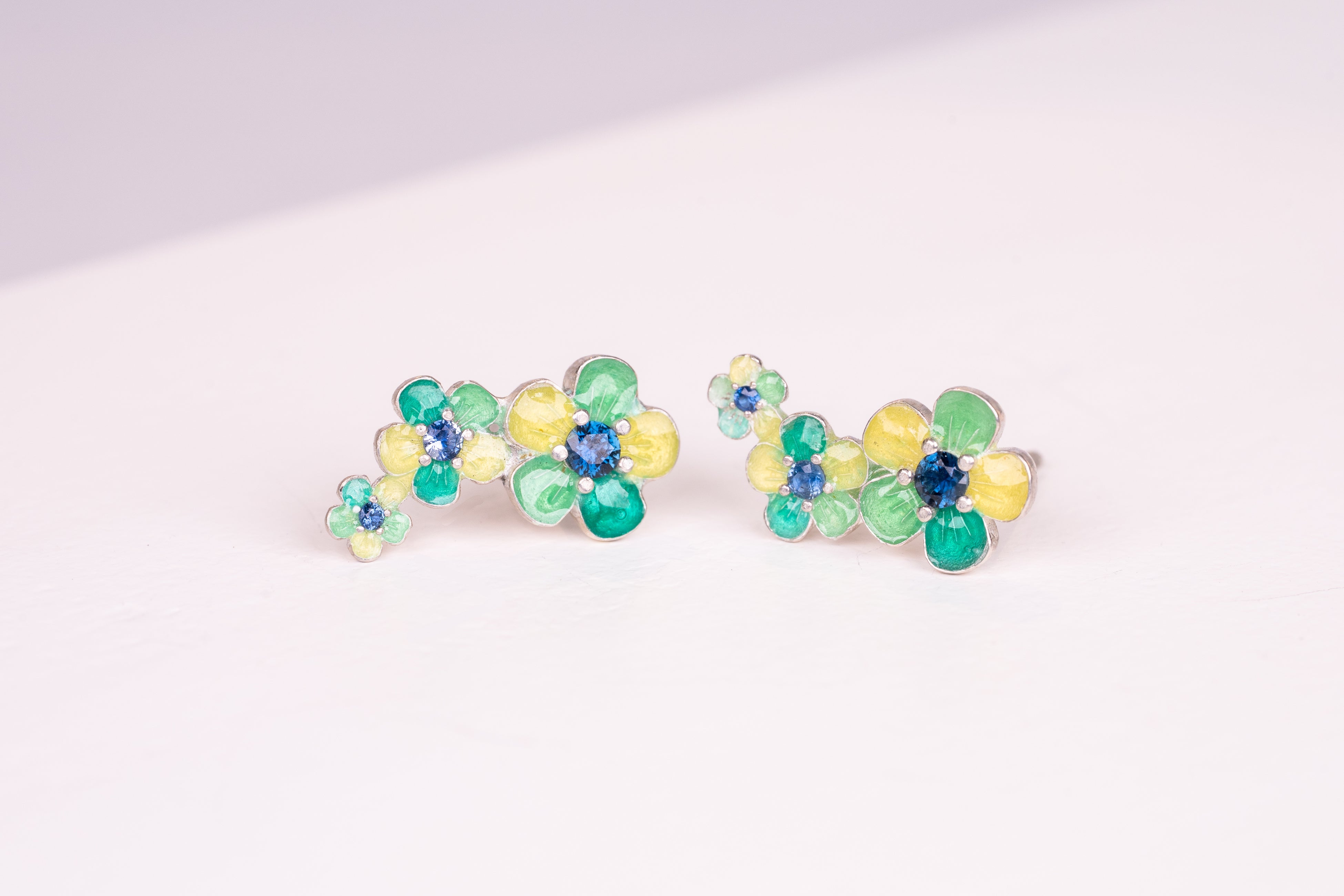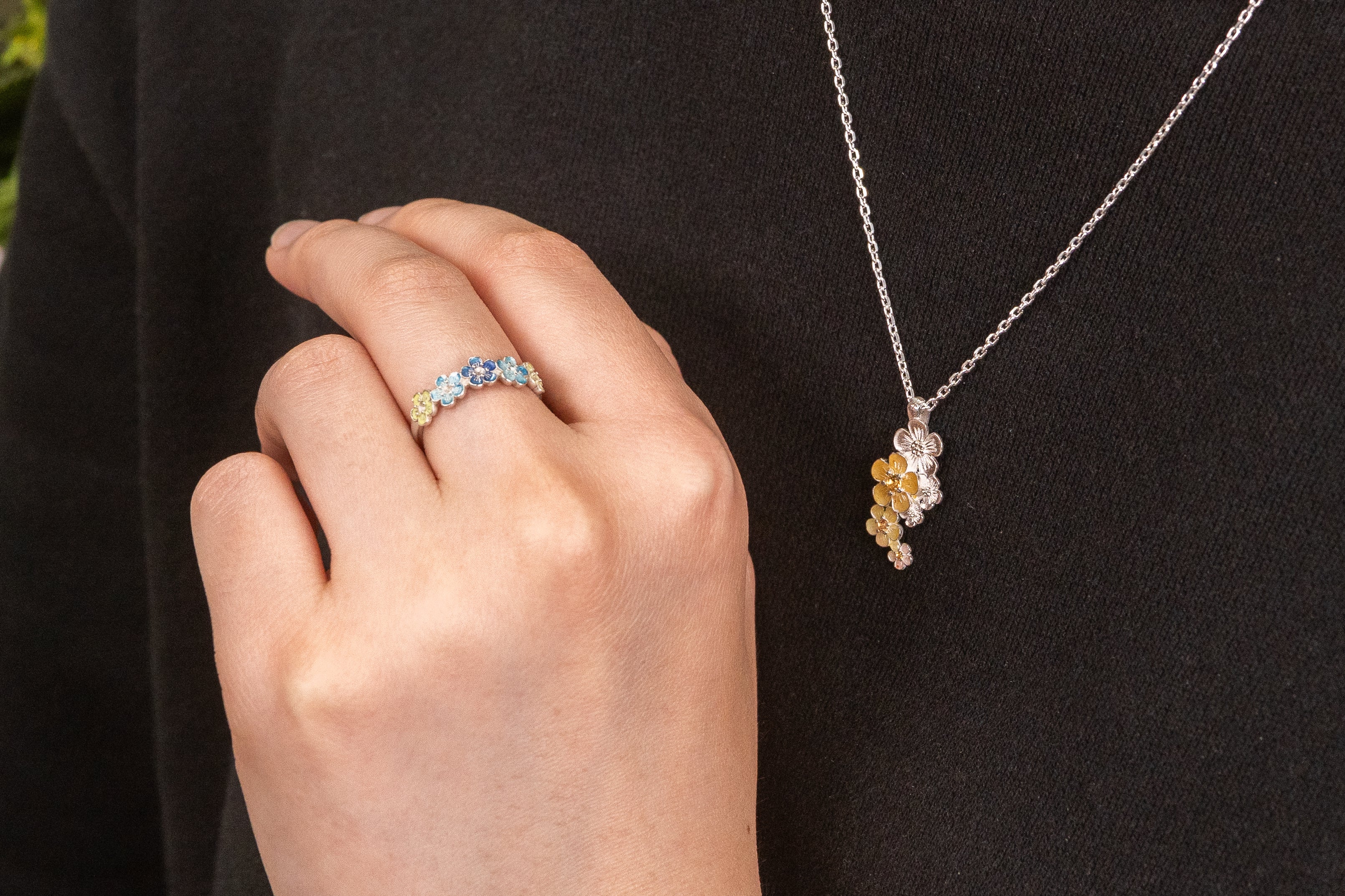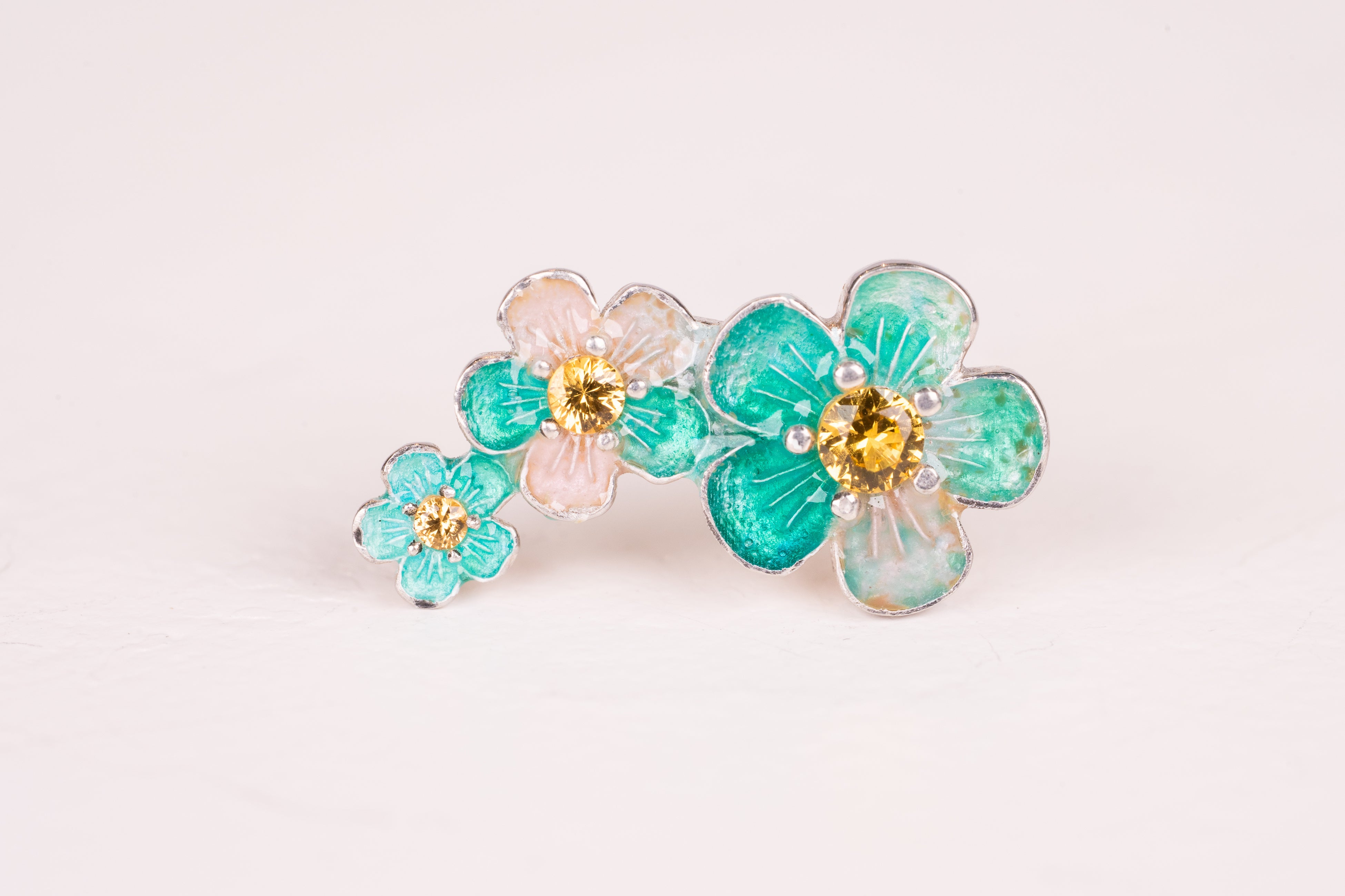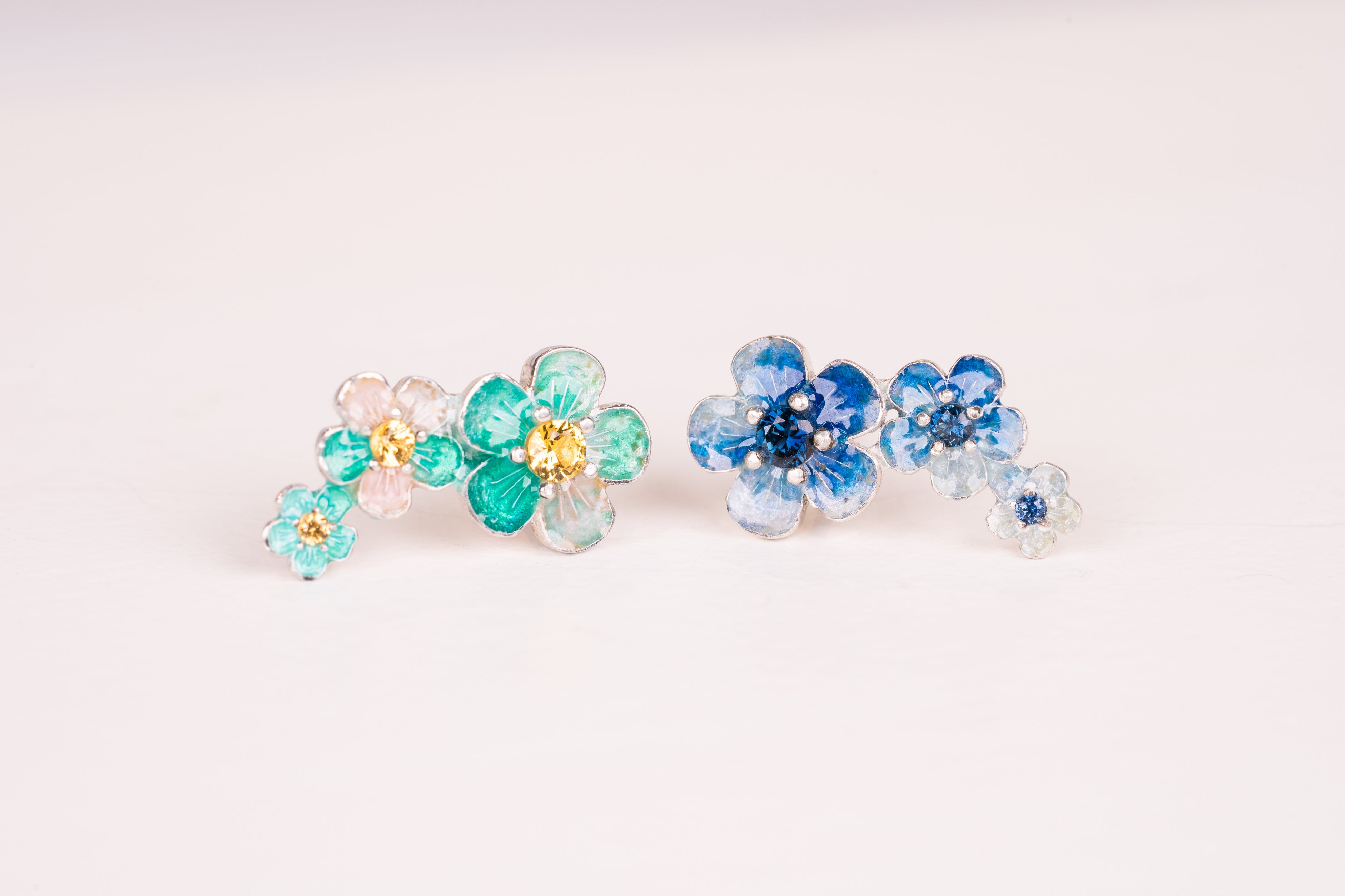 今回は第一弾として「花モチーフのセットアイテム」という形で、エマーユリング・エマーユピアス・エマーユネックレスの3つをご提供開始いたします。