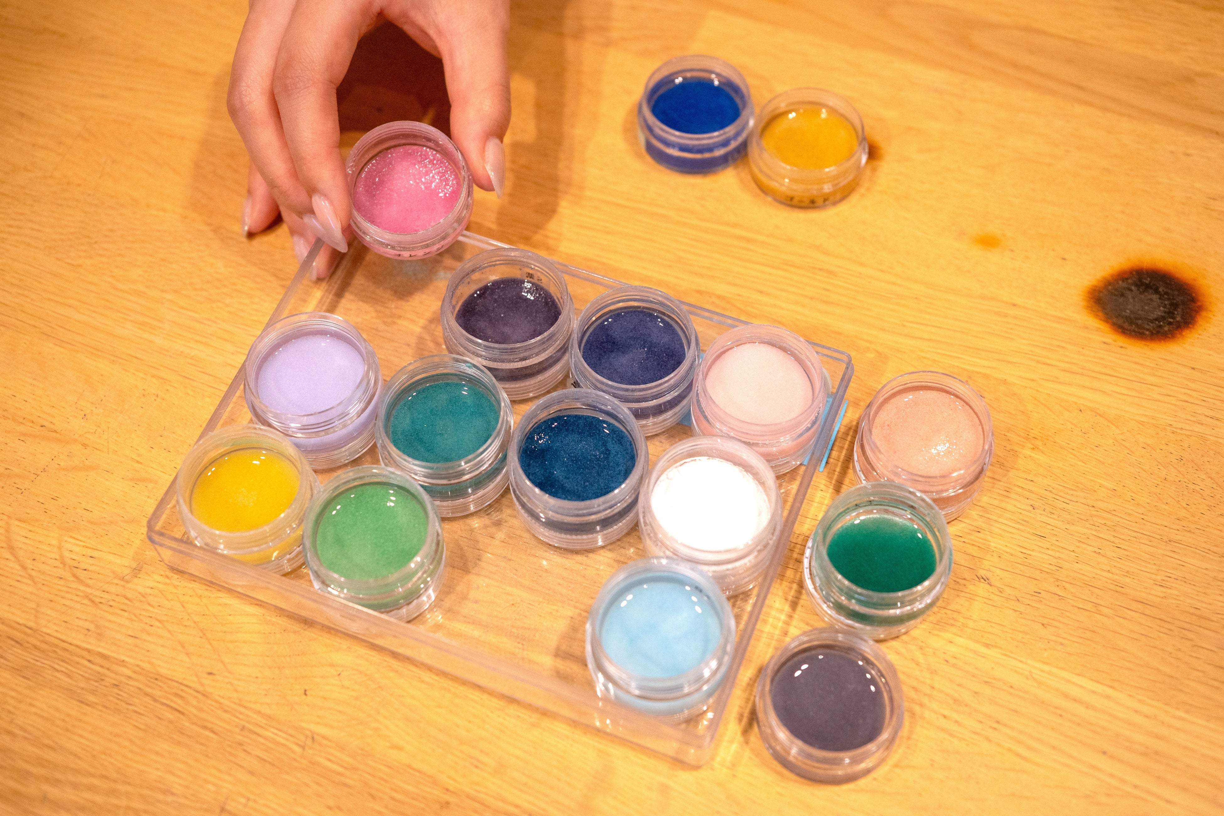 これらの色を工房にて自由にお選びいただき、好きな色の組み合わせを塗っていくことによって、世界で唯一の、自分だけのジュエリーをおつくりいただけます。