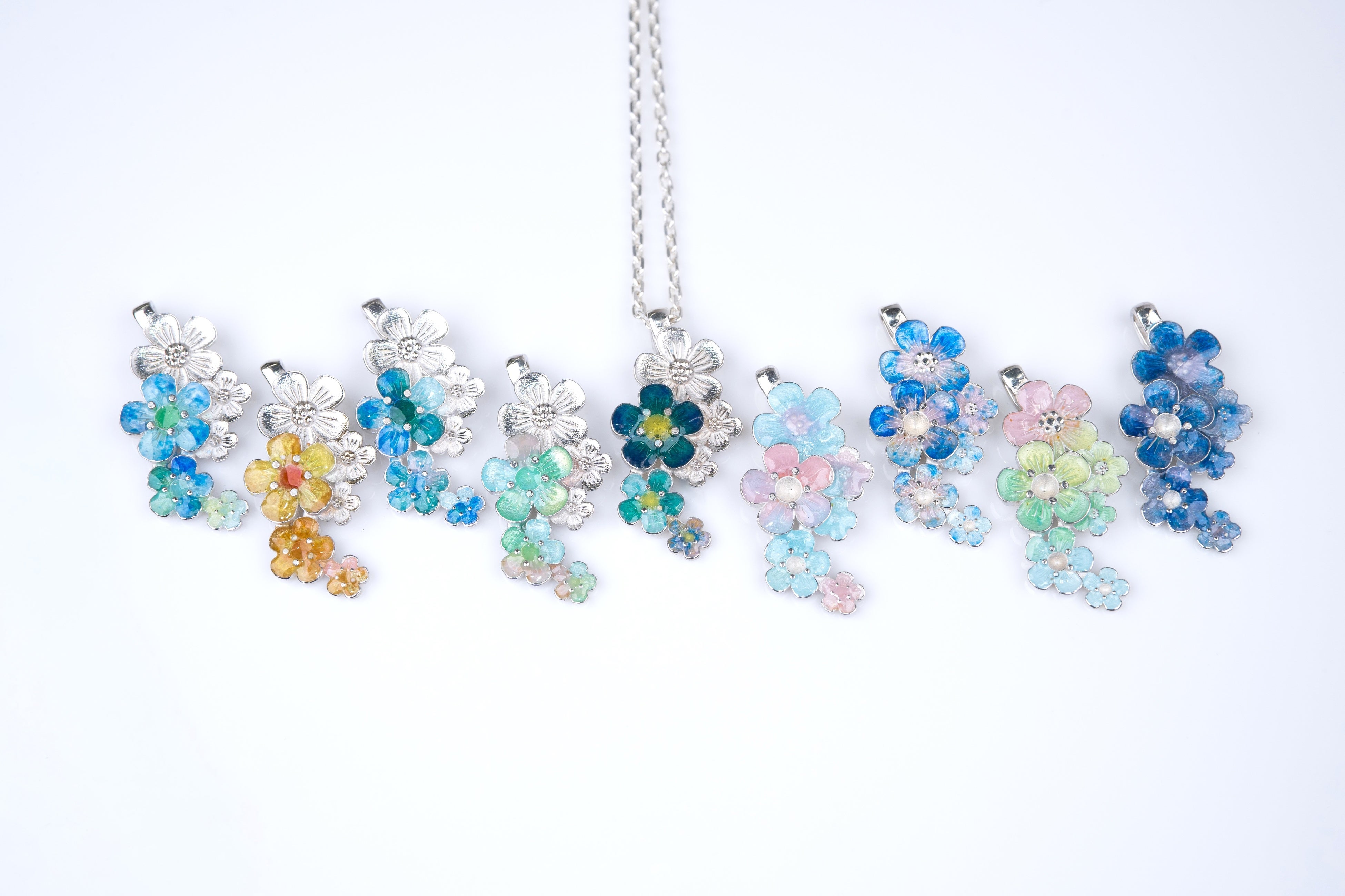 その「エマーユリング」を制作いただいたお客様に当初よりアンケートを実施しておりますがそのアンケートでまた違った色を使って製作したいという希望と、ネックレス(ペンダント)、ピアス、ヘアアクセサリー等をトータルコーディネートしたいというアンケート結果が多く寄せられており、早くからピアス・ネックレスの商品開発を行ってまいりました。