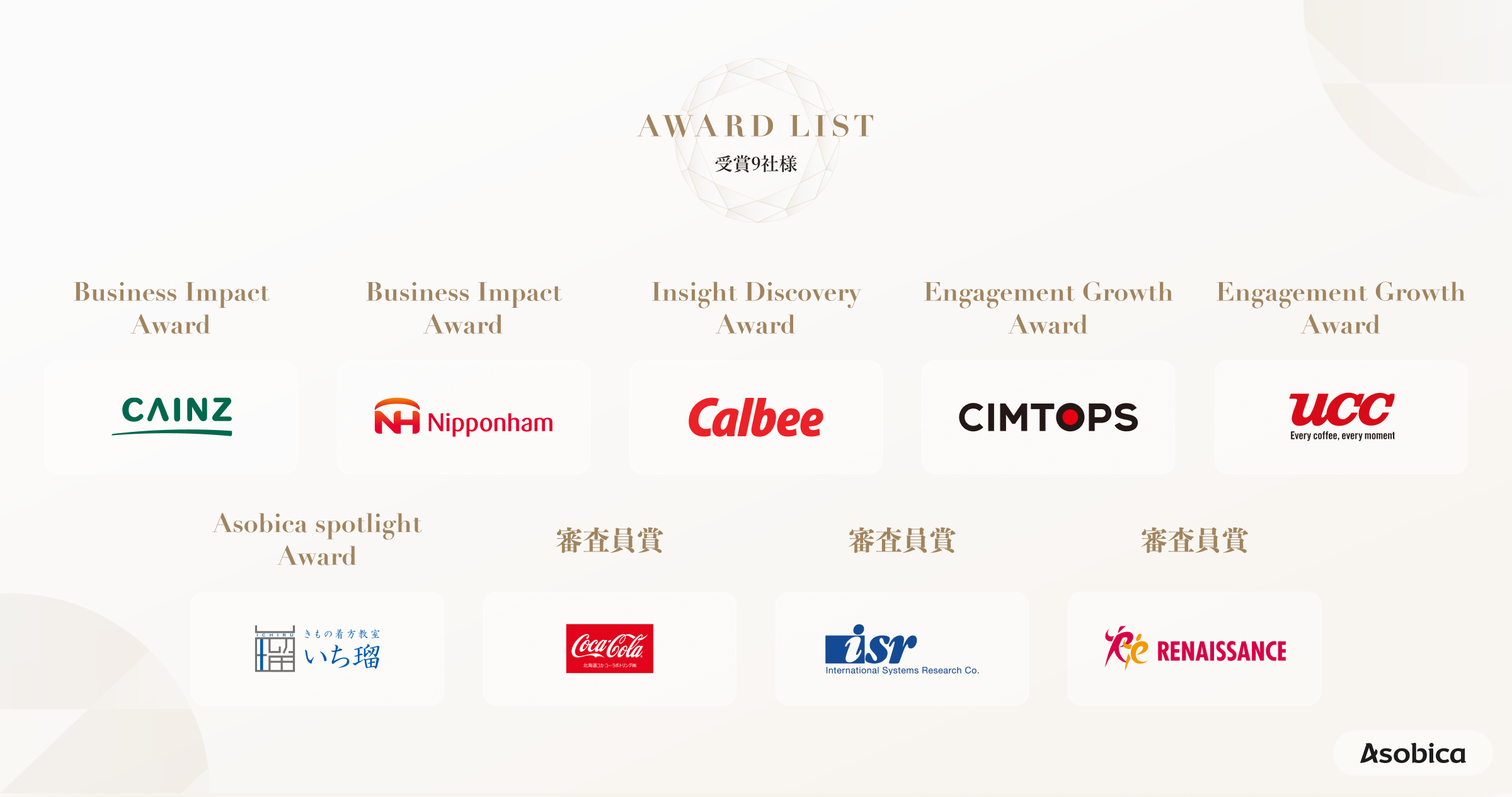 「coorum(コーラム)」をご利用いただいている導入企業への感謝と、顧客・ファンとの継続的なコミュニケーションや、顧客体験を向上させた日々の取り組みを讃え、広く発信するために2023年より運営しております。素晴らしい実績ならびに積極的な取り組みを行った企業の中から、「Insight Discovery Award」「Business Impact Award」「Engagement Growth Award」「Asobica Spotlight Award」「審査員賞」といった全5部門が選出されるアワードです。