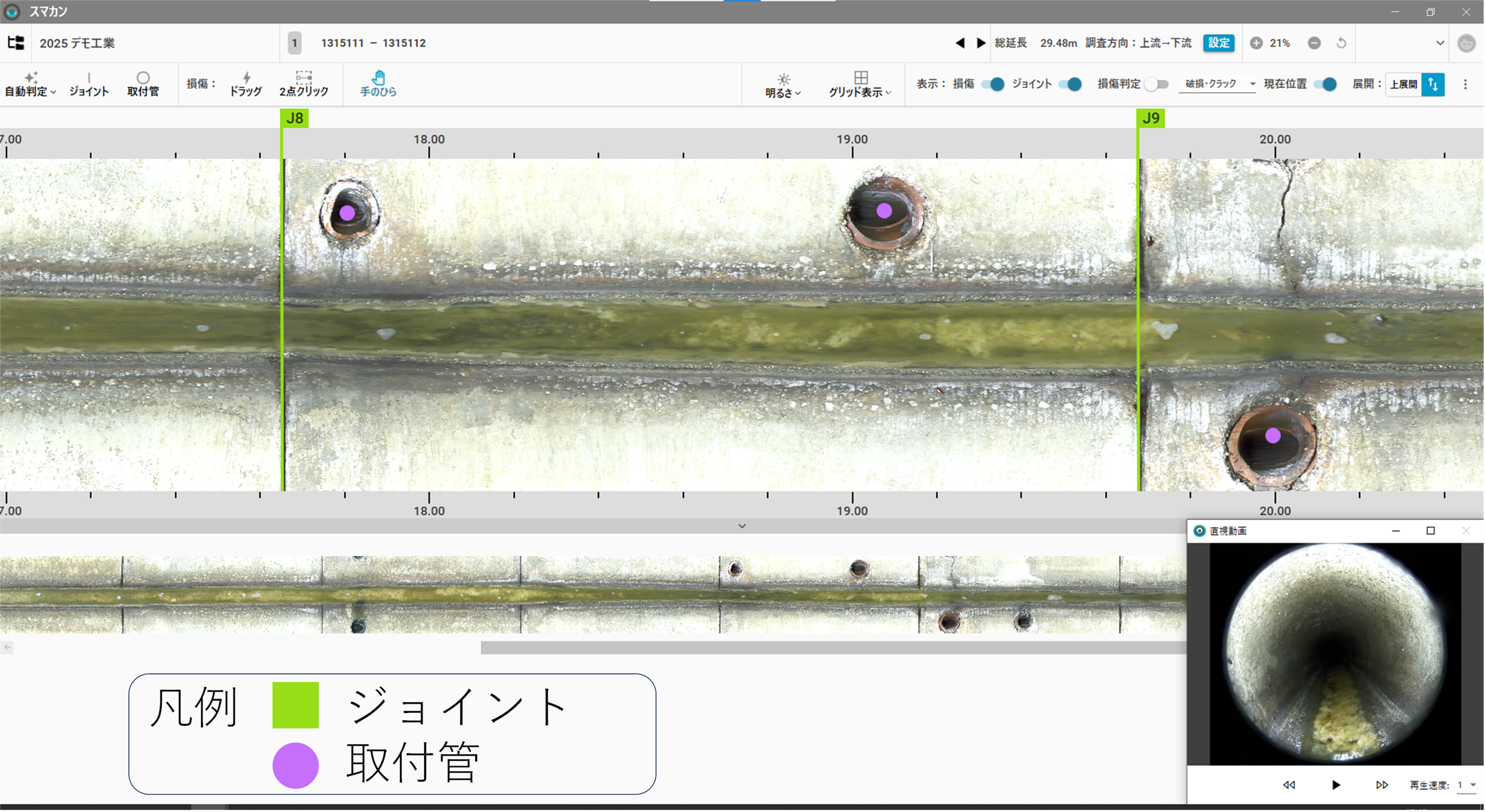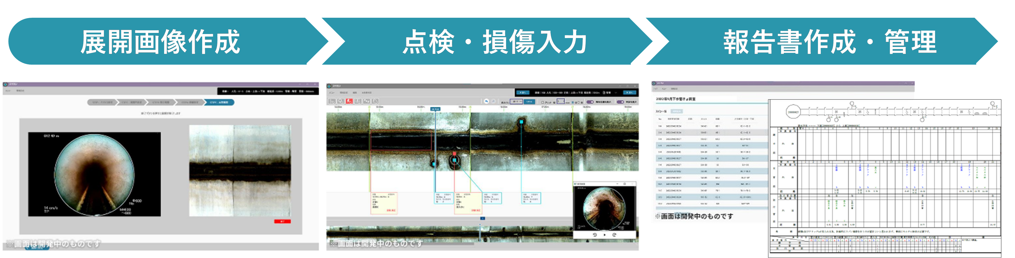 「スマカン」は、広角展開式カメラで撮影した下水道管路内の動画を帯状の画像にする「展開画像の作成」から、熟練技術者による「点検・損傷判定結果の入力」、「調査報告書の出力」までをワンストップで行うことができるソフトウェアです。