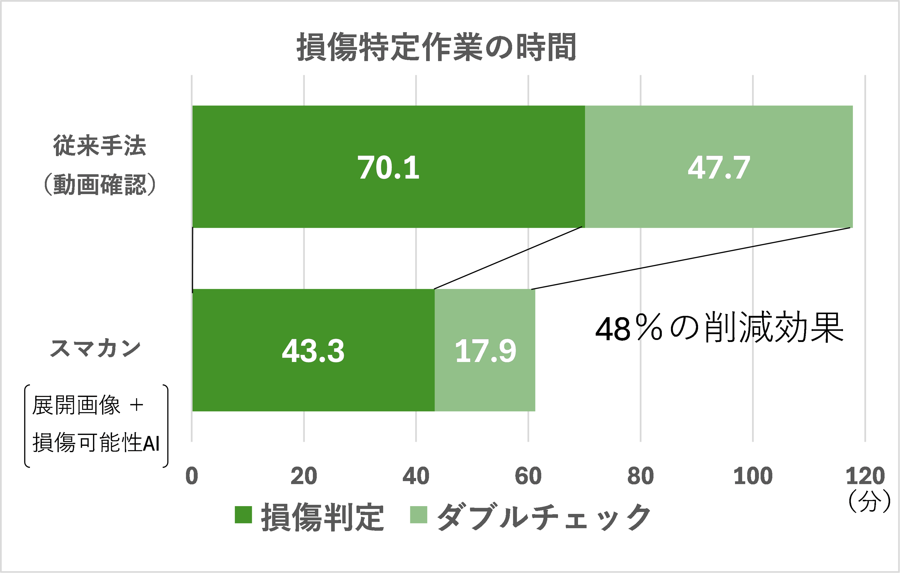 これらの機能を実装した「スマカン」を活用することにより、これまで目視で確認していた取付管の位置や損傷箇所が自動抽出できるので、点検作業の効率化につながり、熟練技術者の配置も不要となります。なお、損傷箇所を特定する作業時間(ダブルチェック含む)は、従来手法と比べて48%削減できます。