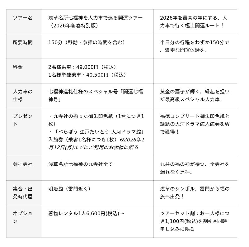 浅草で観光人力車を運営する株式会社時代屋(本社:東京都台東区雷門、代表取締役:藤原英則)は、新たな年の「良運」と「福徳」を力強く招き入れる『浅草名所七福神を人力車で巡る開運ツアー』を、さらなる特別な体験を加えて、2025年12月15日(月)より販売開始いたします。
