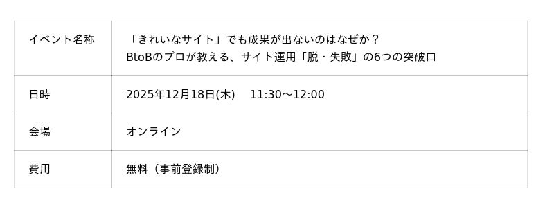『「きれいなサイト」でも成果が出ないのはなぜか?BtoBのプロが教える、サイト運用「脱・失敗」の6つの突破口』を開催いたします。