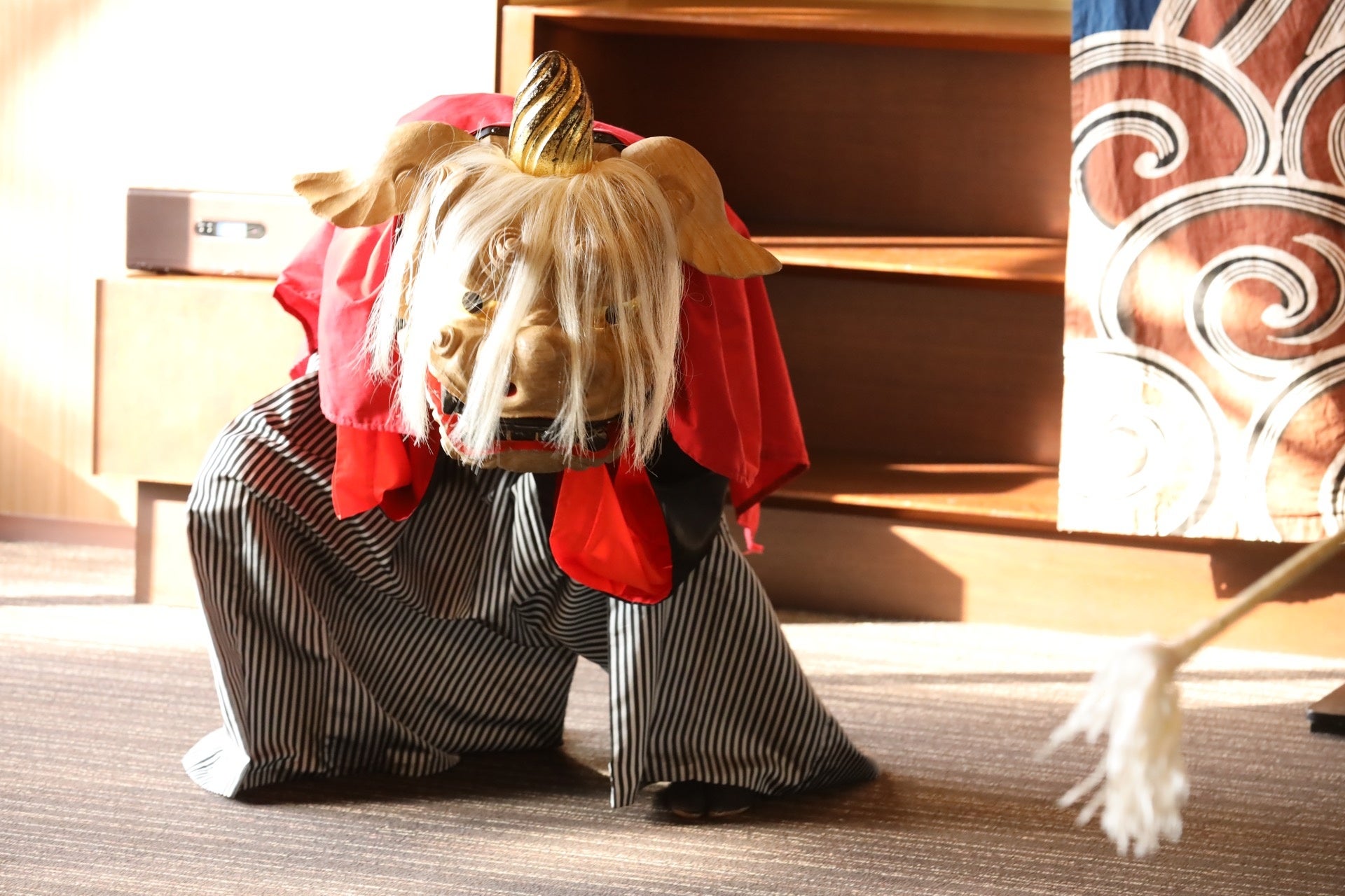 知田工房で作った加賀獅子頭を使った加賀獅子舞が、加賀市にある温泉旅館「界 加賀」で毎日見られるということで行ってみることに。界 加賀ではホテルの従業員が保存会の方達に加賀獅子舞を習い、毎日披露している。400年以上の歴史を持つ加賀獅子舞の特徴は、長い棒を持って獅子に立ち向かう「棒振り」がいること。獅子を倒す様子を悪霊に見せることで、退散させるのだという。