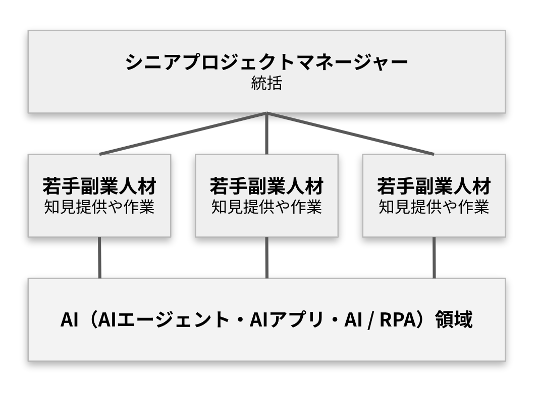 3. AIエージェント活用による業務の標準化当社が保有するAIエージェント開発の知見を活かし、プロジェクト内でのタスク自動化を積極的に実装していきます。リサーチやデータ処理、ドラフト作成などの業務をAIエージェントに置き換えることが可能なため、人の稼働を最小限に抑えつつ、スピードと品質を両立します。