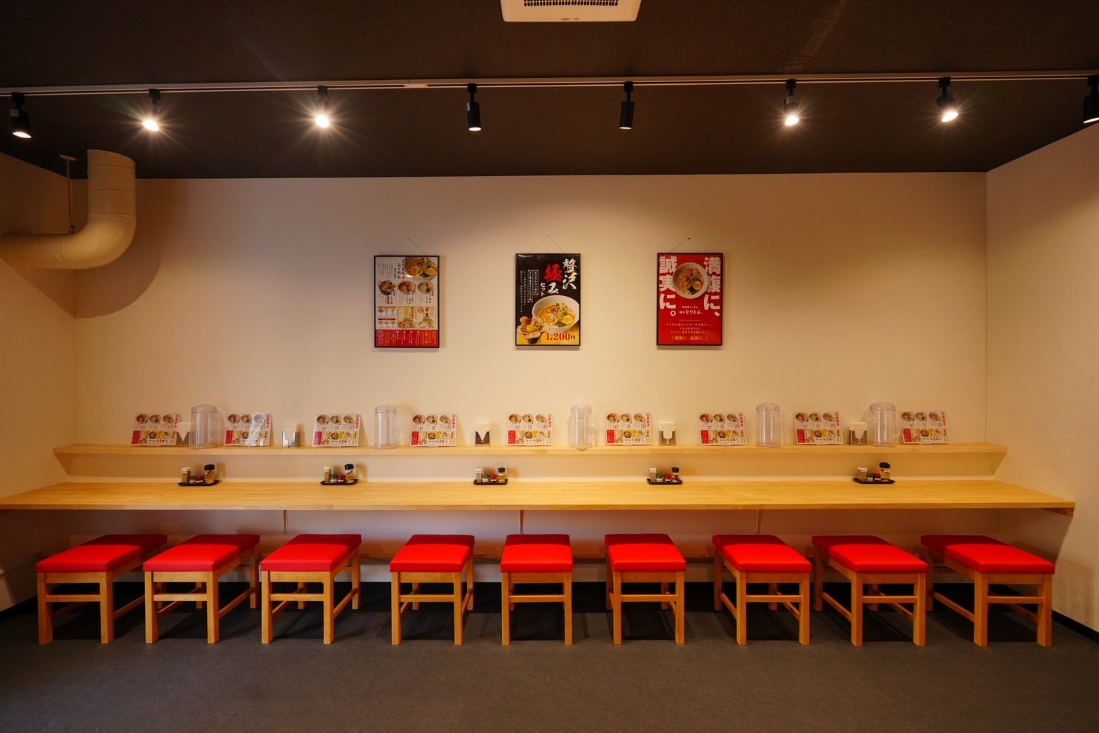 配色は白と黒を基調としつつ、空間に占める赤色の割合にもこだわっています。食欲や活力を想起させる色として赤を効果的に用い、学生街にふさわしいエネルギーのある空間を演出しています。