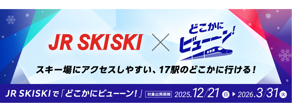 「どこかにビューーン!」の特別企画として、「JR SKISKIで『どこかにビューーン!』」を実施します。期間限定で、行き先候補をスキー場にアクセスしやすい17駅に限定してご利用いただけます。
