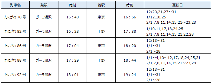 【スキー場からのお帰りに便利なガーラ湯沢発主な上り直通列車】