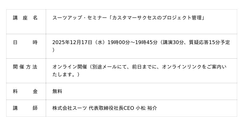当社では、2025年12月17日(水)19時から、当社代表の小松が講師を務めるスーツアップ・セミナー「カスタマーサクセスのプロジェクト管理」を無料開催します。