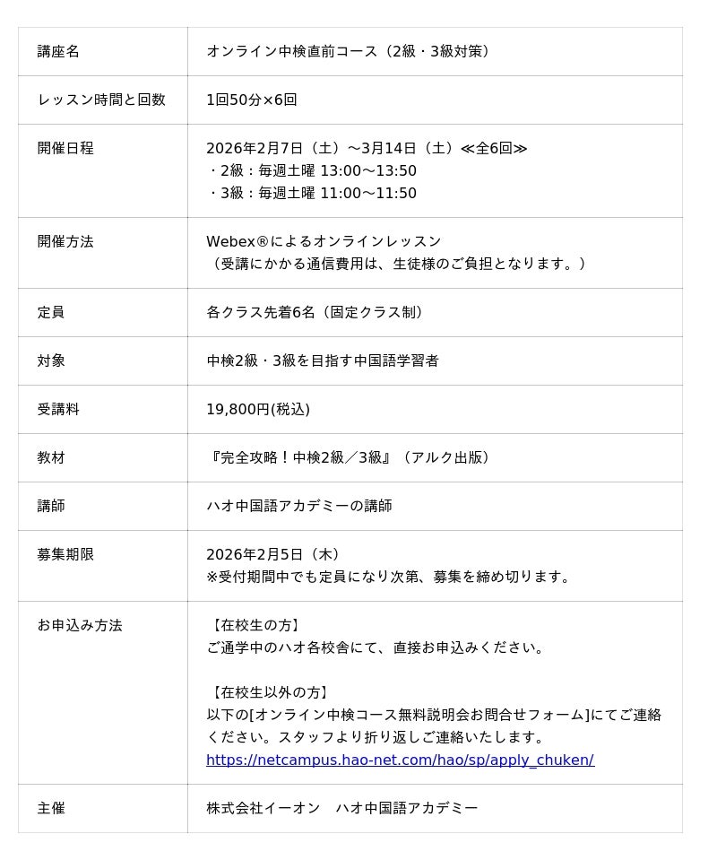 株式会社イーオン(本社:東京都新宿区、代表取締役社長:重野卓、以下「イーオン」)が運営するハオ中国語アカデミーは、2026年3月実施予定の中国語検定(以下、「中検」)に向けた対策講座として、「オンライン中検直前コース(2級・3級)」を2026年2月よりオンラインにて全6回の短期集中型プログラムを開講いたします。