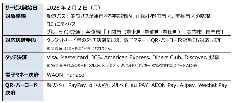 船木鉄道株式会社(本社:山口県宇部市、代表取締役社長:田中 敬一、以下:船鉄バス)、ブルーライン交通株式会社(本社:山口県下関市、代表取締役社長:伊藤 修、以下:ブルーライン交通)、三井住友カード株式会社(本社:東京都江東区、代表取締役 社長執行役員CEO:大西 幸彦、以下:三井住友カード)、株式会社ジェーシービー(本社:東京都港区、代表取締役会長兼執行役員社長:二重 孝好)、レシップ株式会社(本社:岐阜県本巣市、代表取締役社長:北野 元昭)、株式会社トランザクション・メディア・ネットワークス(本社:東京都中央区、代表取締役社長:大高 敦、以下TMN)、株式会社ニモカ(本社:福岡県福岡市、代表取締役社長:田端 敦)、QUADRAC株式会社(本社:東京都中央区、代表取締役社長:高田 昌幸、以下:QUADRAC)は、2026年2月2日(月)より、船鉄バスおよびブルーライン交通が運行する路線バスにおいて、三井住友カードの公共交通機関向けソリューション「stera transit」を活用したクレジットカード等(※)のタッチ決済による乗車サービスを開始します。あわせて、TMNの決済ゲートウェイサービスを活用し、電子マネーおよびQR・バーコード決済の対応を開始します。