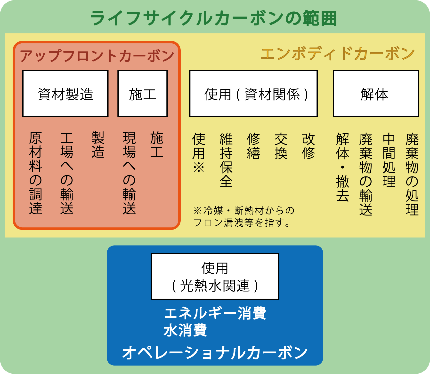 近年、地球温暖化対策として2050年カーボンニュートラルの実現に向けた取り組みが活発化しています。日本のCO2排出量のうち約40%を占める建築物分野では、ZEH(ネット・ゼロ・エネルギー・ハウス)やZEB(ネット・ゼロ・エネルギー・ビル)の推進により、建物の利用時に発生する「オペレーションカーボン(=日常生活で発生するCO2排出量)」の削減が進められてきました。