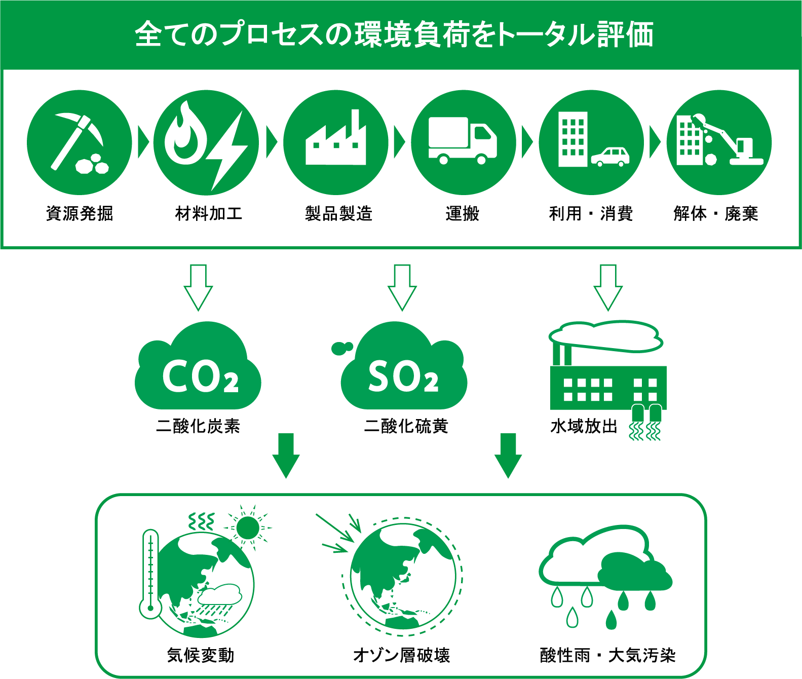 製品やサービスが原材料の採取から製造、使用、廃棄、リサイクルに至るまでのライフサイクル全体を通じて、その環境負荷を定量的に評価する手法のこと。