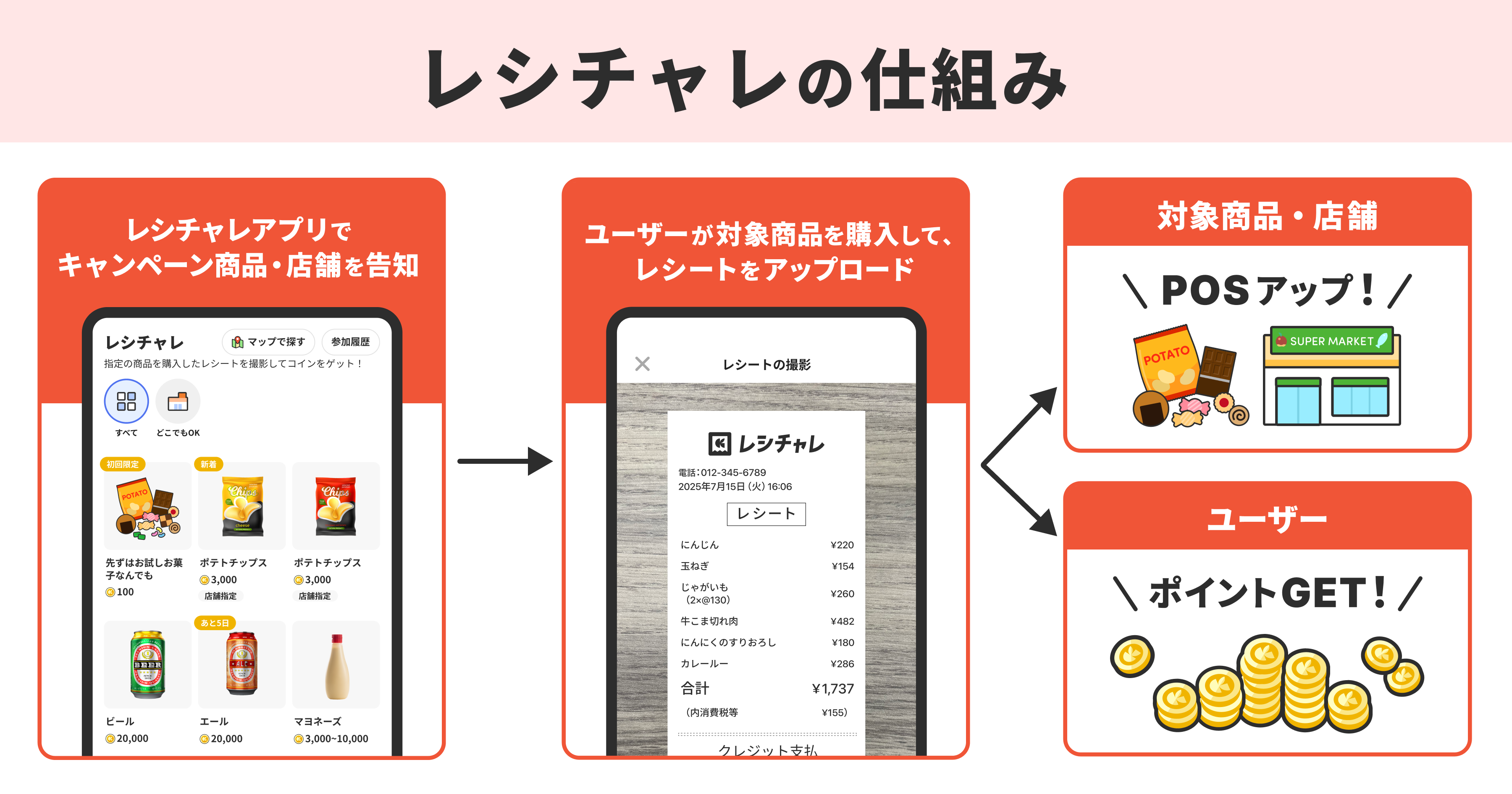 当社提供のレシート買取りアプリ「レシチャレ」は、アプリ上にキャンペーン商品を掲載し、アプリユーザーはその商品を購入したレシートをアップロードすることによってポイントが獲得できる仕組みです。