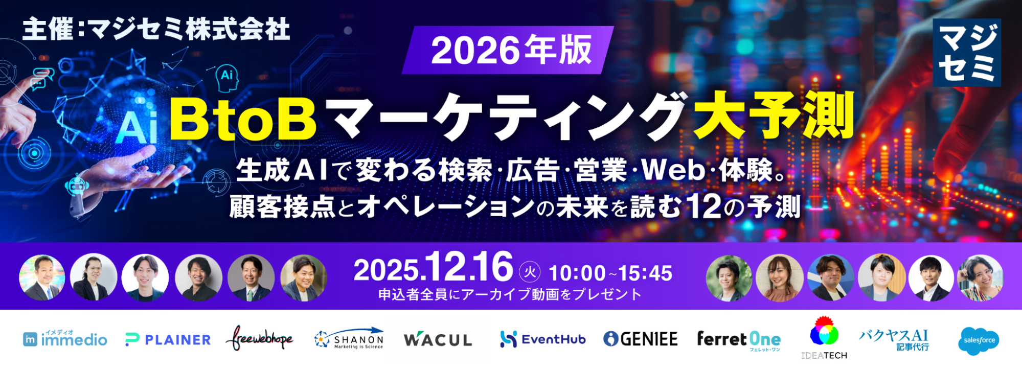 株式会社immedio(本社:東京都渋谷区、代表取締役:浜田 英揮)は、2025年12月16日(火)に「2026年版 BtoBマーケティング大予測 ~生成AIで変わる検索・広告・営業・Web・体験。顧客接点とオペレーションの未来を読む12の予測~」に登壇いたします。