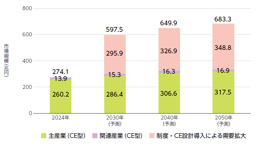 本レポートでは、三菱UFJリサーチ&コンサルティングの協力を得て、国内循環経済型ビジネス市場を独自に推計、現在から2050年までの市場成長を展望しています。これによると、2024年時点の国内循環経済型ビジネスの市場規模は、推計の対象とした14産業分野、主産業のみの合計で約260兆円に達し、非循環経済型を含めた市場全体の27%を占めると明らかになりました。また、今後の新制度や循環経済設計の導入・普及による需要拡大部分も含めると、2030年には約598兆円、2050年には約683兆円まで市場規模が拡大する見込みであると分かりました。