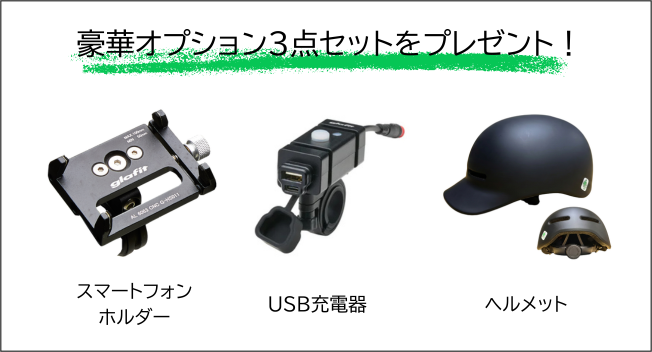 期間中、公式オンラインショップの特別購入ページより「電動サイクルNFR-01」シリーズを購入すると、ライドを快適にする豪華オプションを3点セット(スマートフォンフォルダー、USB充電器、ヘルメット、合計17,320円相当)をプレゼント。