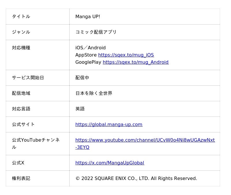株式会社スクウェア・エニックス(本社:東京都新宿区、代表取締役社長:桐生 隆司、以下スクウェア・エニックス)と、Link-Uグループ株式会社のグループ会社である株式会社Link-U Technologies(本社:東京都千代田区、代表取締役CEO:大串 拓也)が共同運営する海外向けマンガアプリ「Manga UP!」が、全世界累計500万ダウンロードを突破したことをお知らせします。