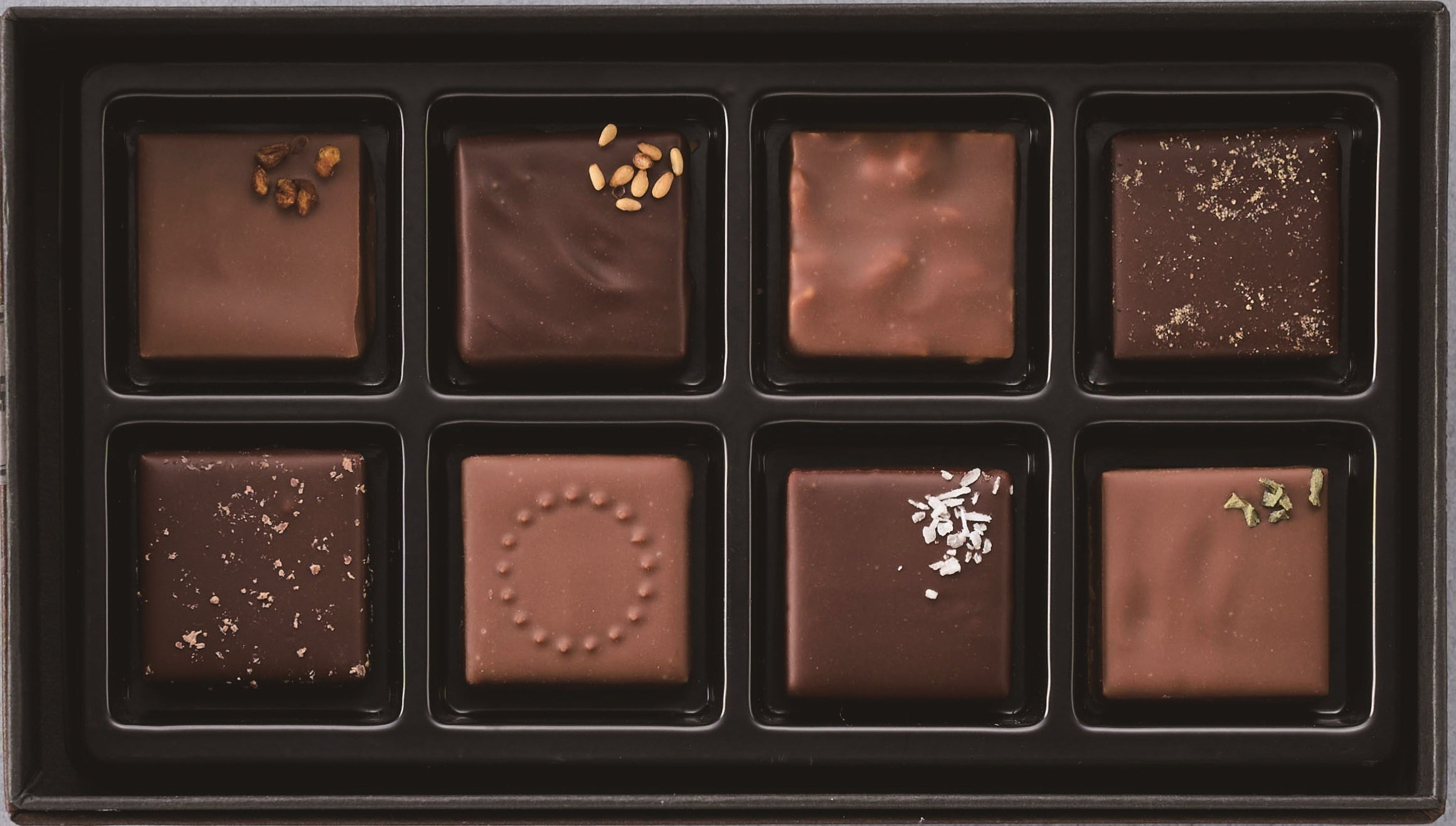 ペルー産やエクアドル産カカオ豆を使った自家製プラリネと素材の出逢い。⿊豆・⿊糖、蕎⻨すだち、ココナッツバニラなど8種をアソートしました。