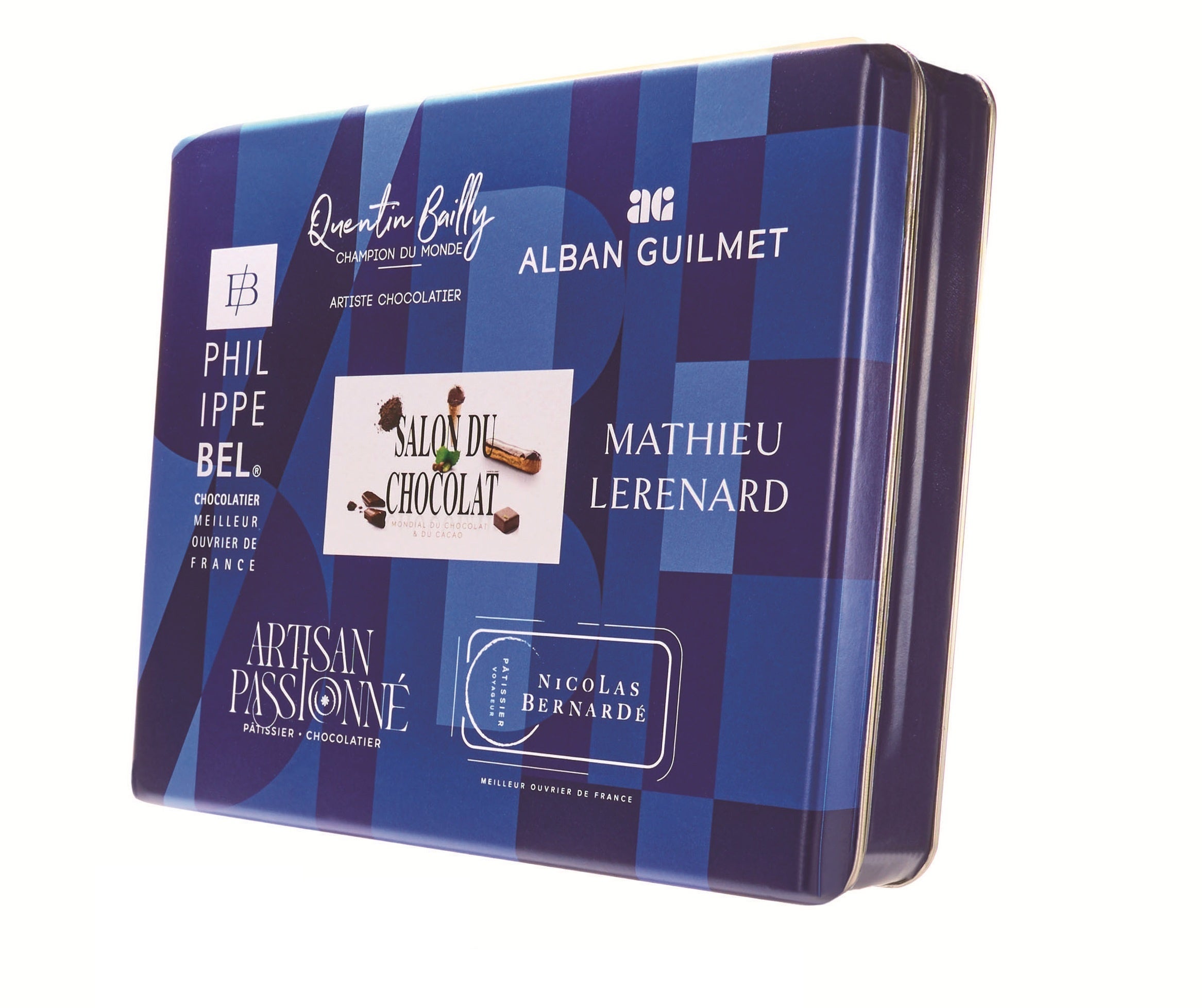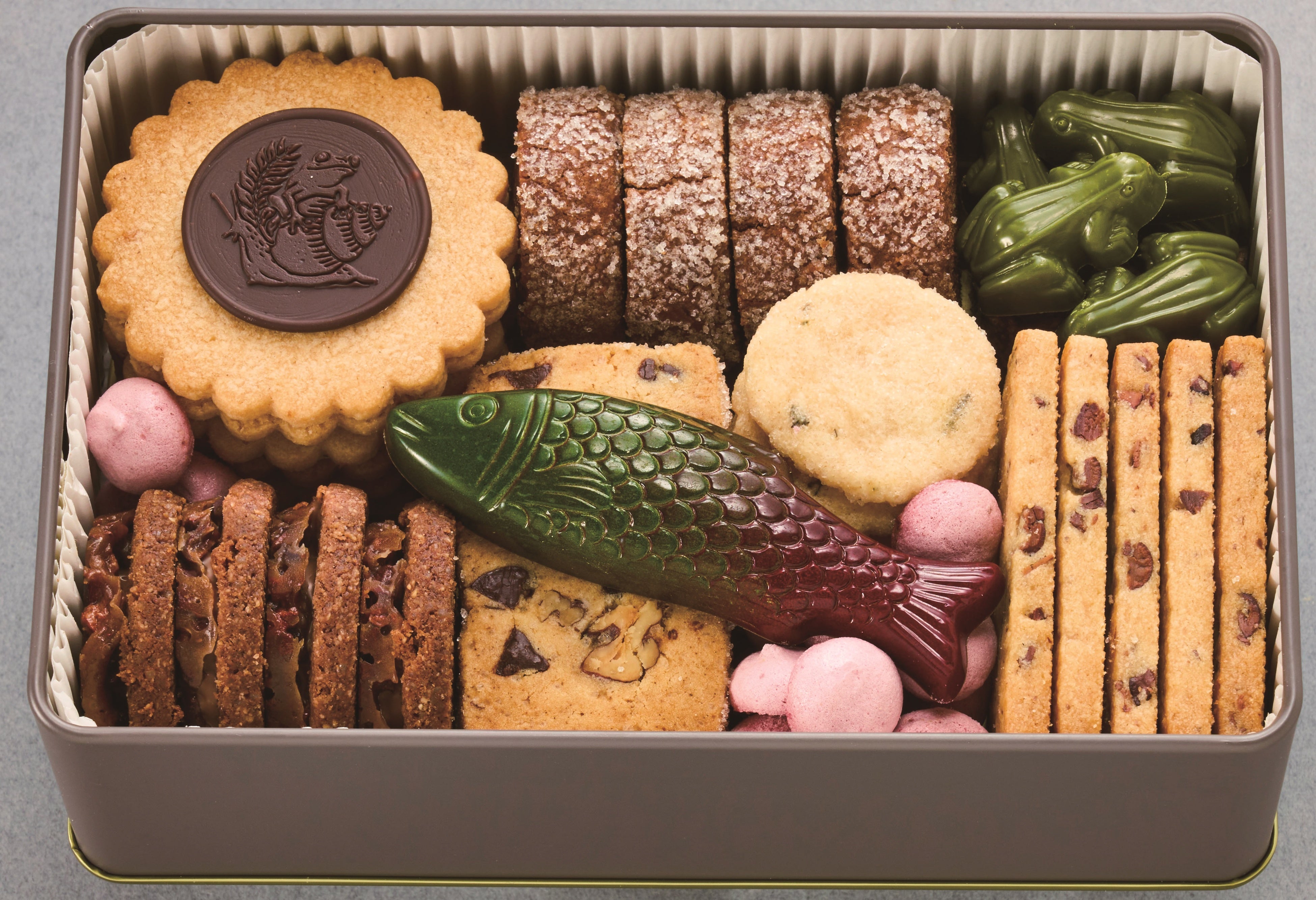 プラリネサンドやチュイルカカオ、ディアマンショコラ、ピーカンナッツ&メープルサブレ、カエル型の抹茶チョコや⿂型のプラリネも入ったブランド初のクッキー⽸です。