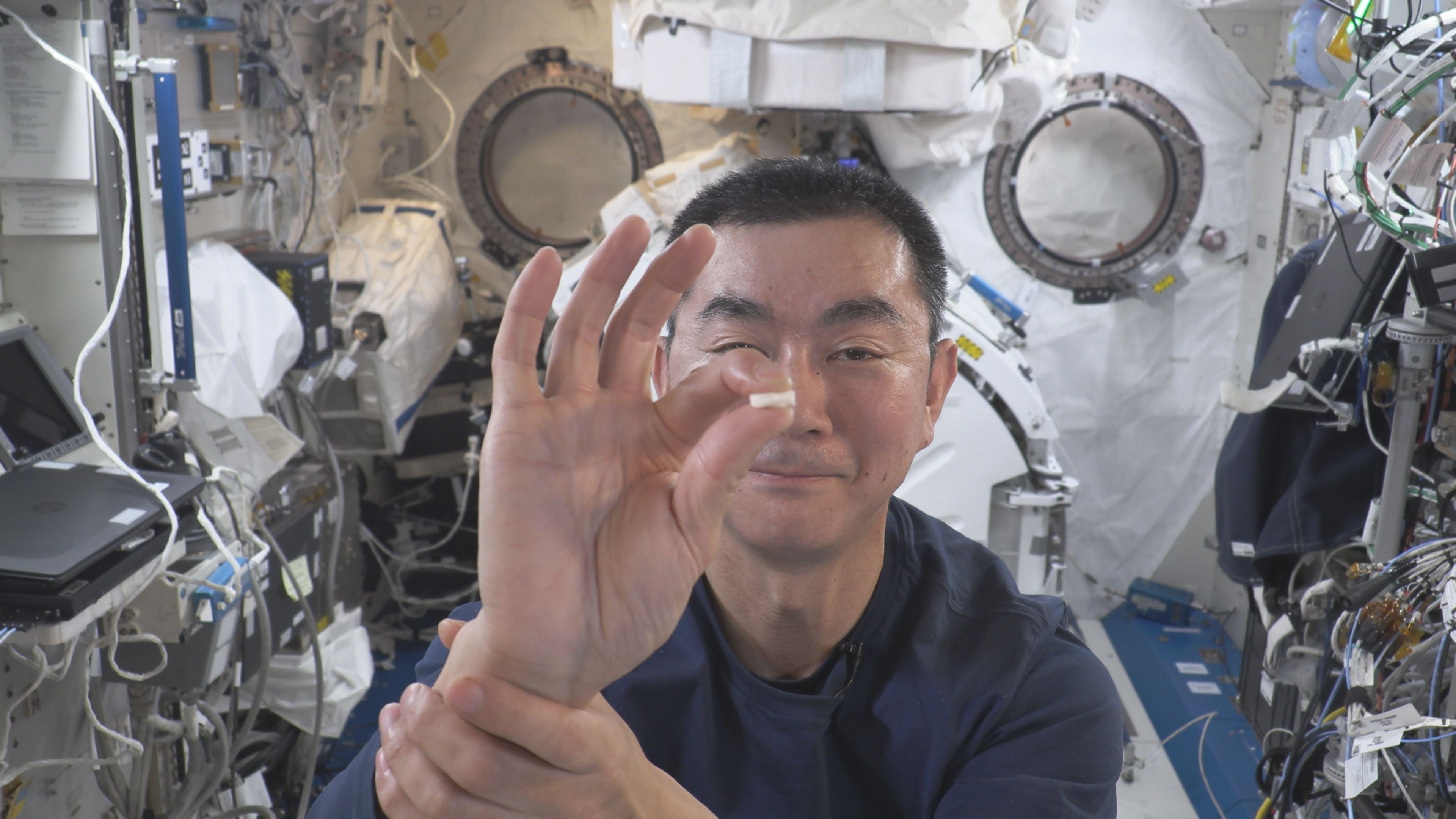カプセルを潰した後の香りを確認する油井宇宙飛行士