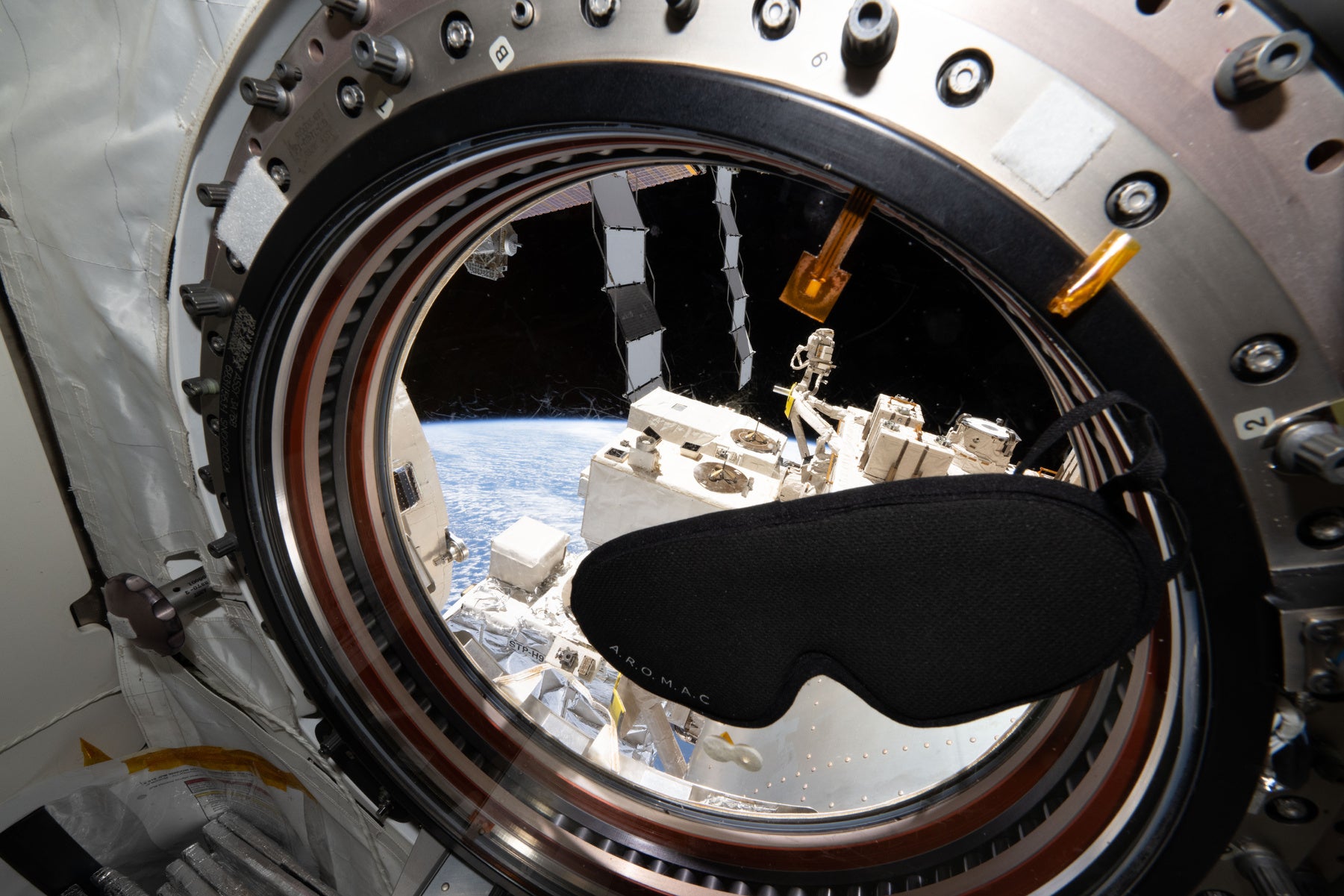 国際宇宙ステーションの窓辺に浮かぶアイマスク