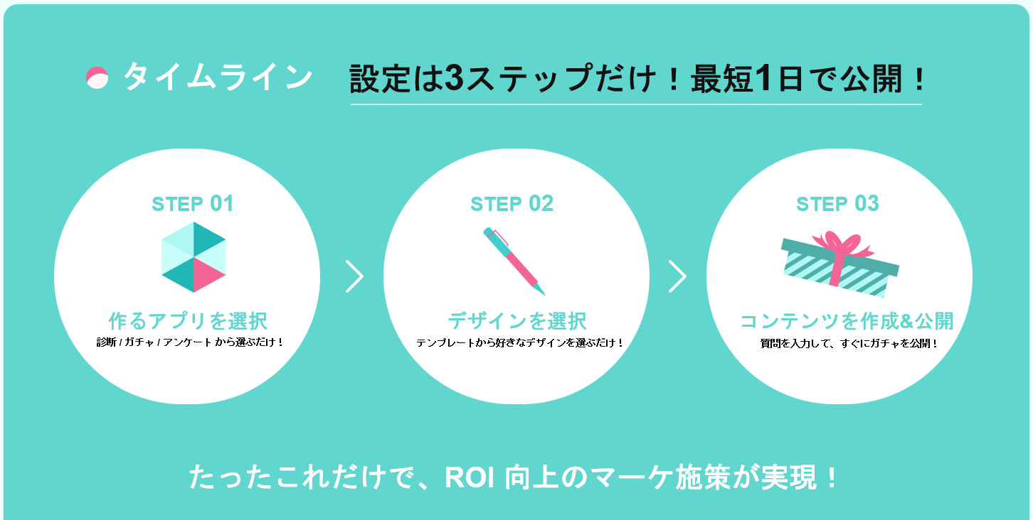 「クロワッサン」では、質問に答えて楽しめる「オリジナル診断」、確率や演出を自由に設定できる「オリジナルガチャ」、自社仕様にカスタマイズ可能な「アンケートコンテンツ」の3タイプのコンテンツを1つのアカウントで作成可能です。